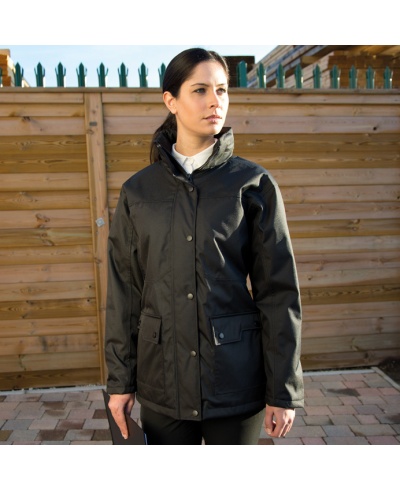 Skrytá odnímatelná kapuce na zip, dvoucestný zip s patentkami, síťovaná očka v podpaží, různé kapsy, střední žebrované manžety, nastavitelný spodní lem, vypasovaný střih, podlepené švy (vodotěsná do 2.000 mm), prodyšná do 2000 g/m², vhodná pro výšivku, přístup pro dekoraci dolním vnitřním zipem a levým vnitřním zipem na prsou.