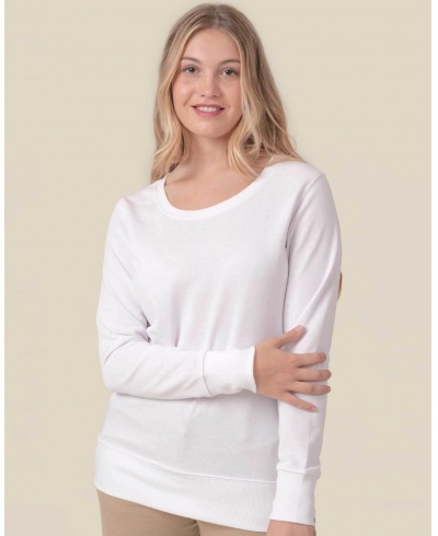 Široký kulatý výstřih, mírně vypasovaný střih, dvojité prošití na výstřihu, manžetách a v pase, 2x1 žebrování na výstřihu, manžetách a v pase, tkanina French Terry.