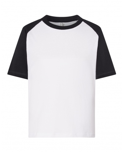 Kulatý výstřih, kontrastní krátké raglánové rukávy, kontrastní lem výstřihu, boční rozparky, odnímatelná cedulka.