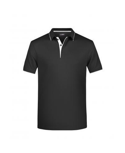 Kvalitní piké, pletený límec a manžety rukávů, kontrastní pruhy na límci a manžetách, léga v kontrastní barvě, knoflíčky tón v tónu, boční rozparky, zapínání na 3 knoflíčky.
