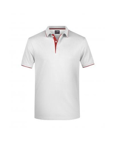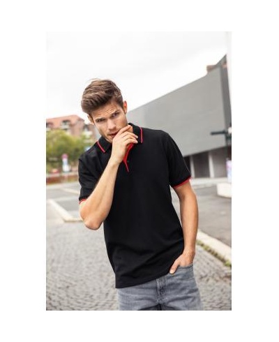 Kvalitní piké, pletený límec a manžety rukávů, kontrastní pruhy na límci a manžetách, léga v kontrastní barvě, knoflíčky tón v tónu, boční rozparky, zapínání na 3 knoflíčky.